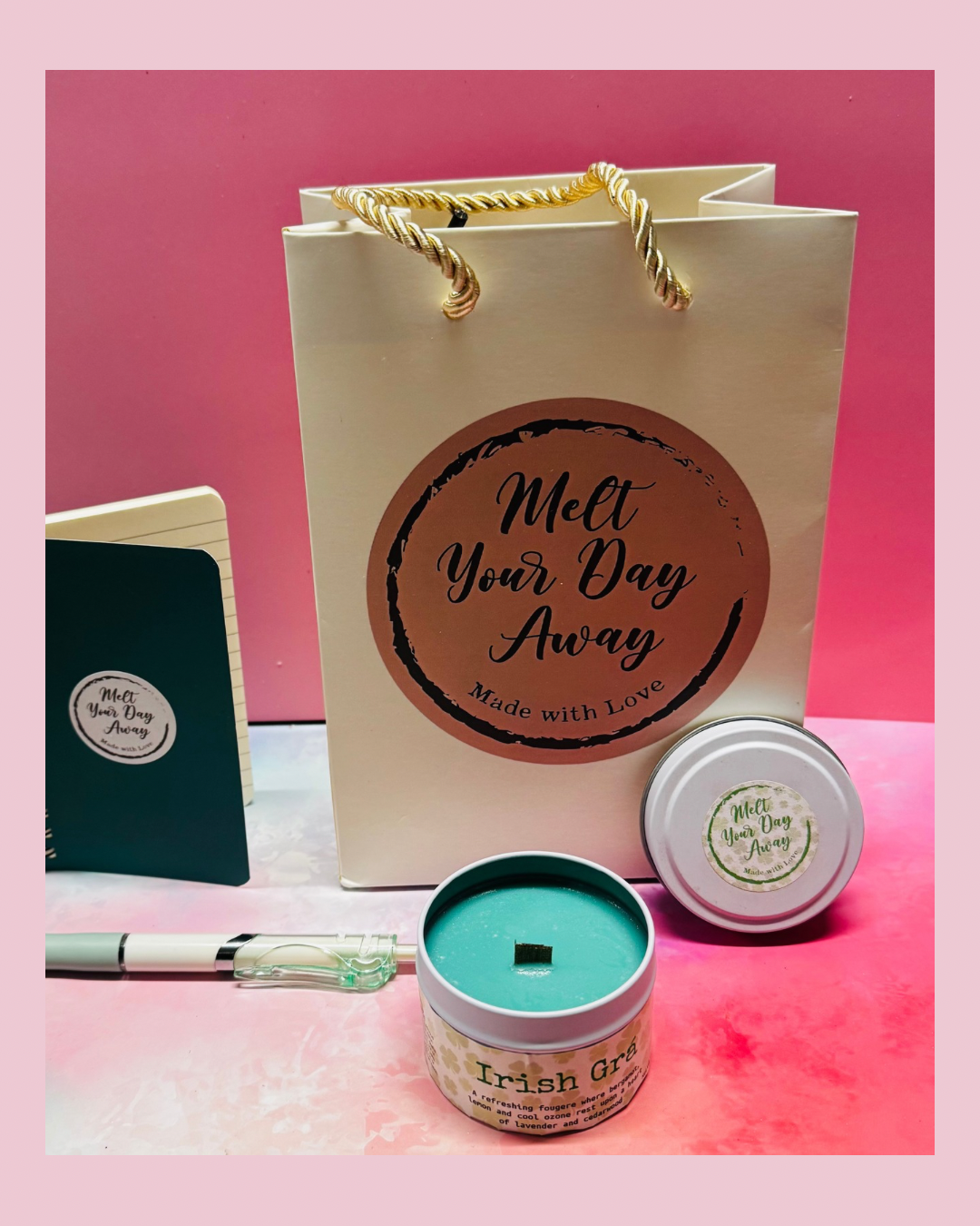 Our Melt Your Day Away Thank You Gift Sets are the sweetest way to say “I appreciate you.” Thoughtfully curated and beautifully packaged, each set includes a our bestselling & much-loved Irish Grá candle, branded notebook and pen.