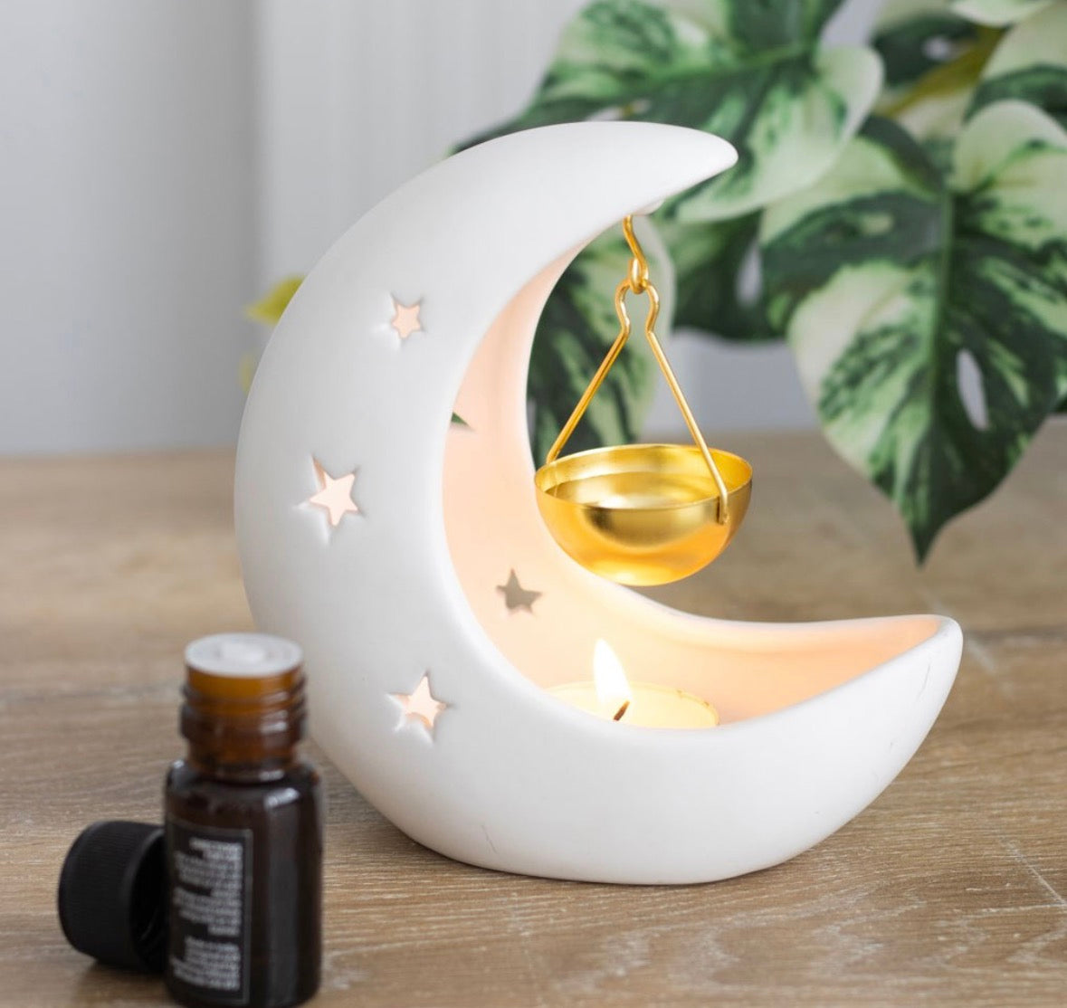 This enchanting white crescent moon oil burner has been designed to enhance the home with a dreamy, magical midnight atmosphere. Fill the hanging bowl with fragrance oil in a mystical scent and watch as the cut out star details cast a celestial glow, adding an ethereal touch to your space. CAUTION: bowl will be hot whilst in use. Recommended for use with fragrance oil diluted with water. Allow to cool completely before handling. Designed by Something Different and part of our exclusive range of oil burners.